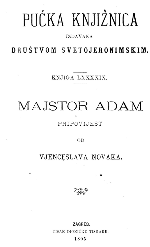 Master Adam is a pedagogical novel written in simple language and intended for a wide audience. It is certainly one of Novak’s weaker works, but also one of his more widely read ones. It was published by the society Sveti Jeronim, which at the turn of the nineteenth into the twentieth century dominated the publishing field in Croatia. Sveti Jeronim produced a large number of educational booklets and some novels, and thanks to strong support from the Catholic Church and certain political parties, as well as low prices, its publications were widely read.